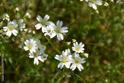 Little white wildflowers (Stellaria holostea) are blooming in nature in sunny summer day.