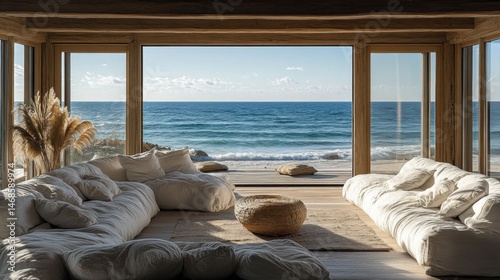 living room, interior, ocean view, wooden frame, beach, wave, blue sea, clear sky, natural light, wooden floor, minimalist, relaxation, comfort, cosy, daylight, seascape, horizon, tranquil, furniture, interior design, modern style, contemporary, sky blue, window frame