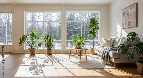 Living Room Interior with Plants and Sofa.