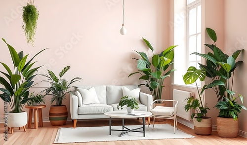 Living Room Oasis with Lush Greenery and Natural Light. AI Generated