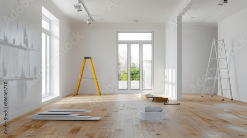 ''living room renovation, walls being painted, new furniture pieces waiting to be assembled, bright and airy space, modern design''