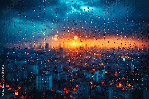 Living Room View with Rainy Window, City Skyline at Dusk, Storm Clouds, Thunderstorm, Urban Rainfall