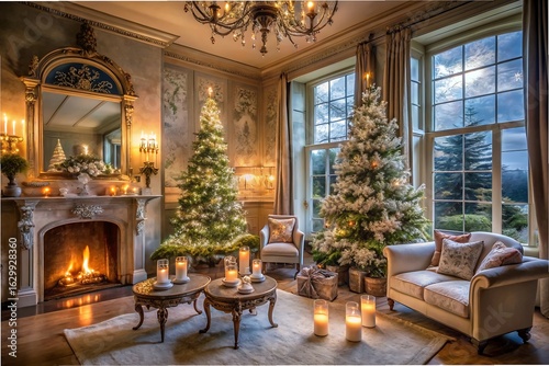 christmas, tree, room, interior, holiday, decoration, winter, house, home, fireplace, season, celebration, new, year, light, candle, furniture, window, ornament, festive, cosy, luxury, elegant, design, christmas, december, living, chair, mirror, chandelier
