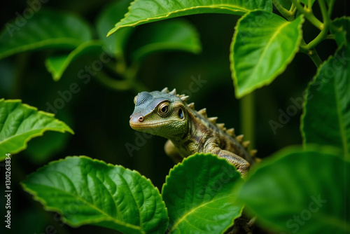 Lizard Peeking Through Lush Green Leaves in Spring