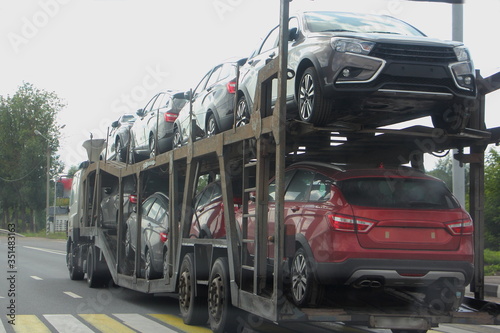Loaded two-level car carrier truck with two-axle car transporter semi trailer carries new Russian cars on suburban highway road, rear side wide view close up, automobile shipping