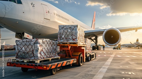 Loading cargo plane outside air freight logistic. Airmail shipping packages. Shipping boxes ready to be delivered.