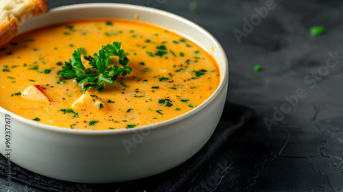 lobster, soup, food, bowl, vegetable, meal, dinner, lunch, healthy, dish, chicken, white, plate, hot, broth, cookery, carrot, epicure, vegetarian, delicious, parsley, bread, meat, green, red