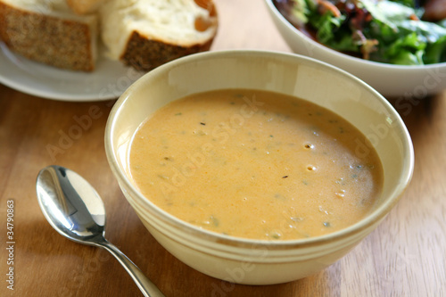 soup, lobster, meat sauce, bowl, orange, food, seafood, seafood, creamy, bread, salad
