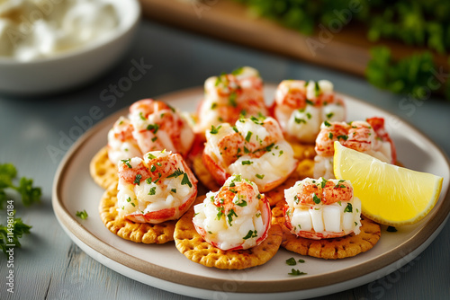Lobster served with seafood crackers and a lemon wedge, rich and inviting presentation, luxurious seafood ambiance