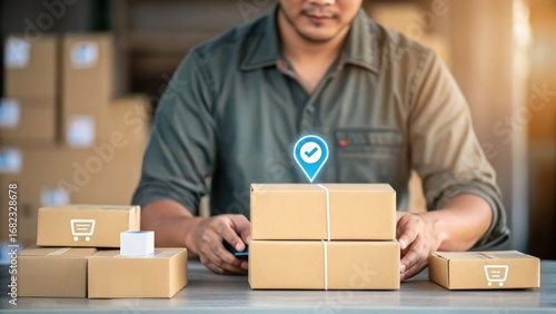 Logistics Concept A person organizes packages with a location marker, emphasizing logistics and shipping efficiency.
