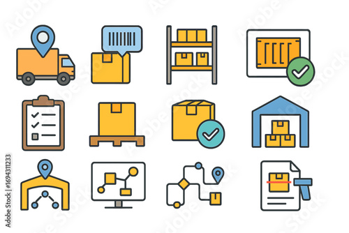 logistic, delivery, packed, shipping, warehouse, supply, chain, icon, set, outline, cargo, truck, package, transport, storage, inventory, parcel, distribution, freight, tracking, handling, box, order
