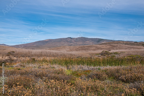 Lompoc, California, USA - November 19, 3021: Back country of Jalama Beach. Dry green-yellow, hilly landscape under blue cloudscape with green reed in dry creek.