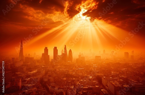 city, skyline, london, sunset, sunbeam, fiery, orange, red, light, urban, architecture, building, aerial, view, dramatic, cloud, heat, summer, foggy, haze, atmosphere, sun, ray, powerful, intense, glowing, silhouette, city landscape, horizon, perspective, hot, illuminated, high-coloured, bright, warm, exterior, sky, tower, business, commercial, modern