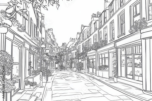 London Street Scene Line Art Drawing - Single line drawing of a charming London street, symbolizing urban exploration, architectural beauty, peaceful atmosphere, quaint shops, and historical charm