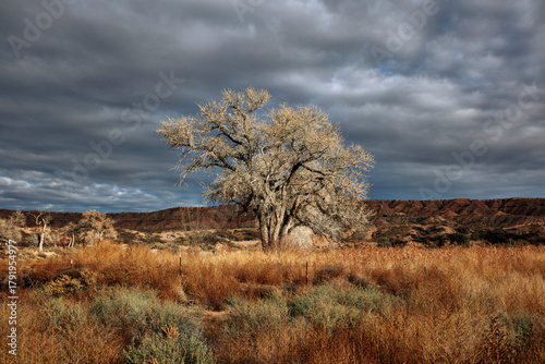 Lone Cottonwood Tree in Desert Landscape Under Stormy Sky
