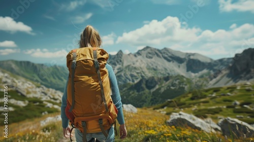 Lone female hiker with a backpack gazes at majestic mountains on a sunny day