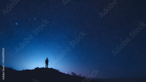 night, sky, star, silhouette, figure, alone, dark, blue, cosmic, space, universe, wonder, solitude, contemplation, horizon, landscape, mysterious, atmosphere, celestial, astronomy, nightscape, twilight, shadow, light, glow, peace, quiet, stillness, elevation, hill, mountain, peak, summit, vantage, view, perspective, distant, remote, isolated, dramatic, majestic, epic, beautiful, serene, tranquil, dreamlike, surreal, abstract