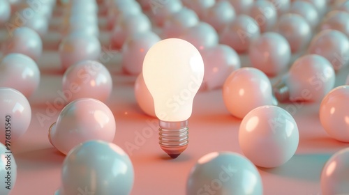 Lone Lightbulb Illuminating Innovation, a vibrant lightbulb surrounded by dimmed counterparts, symbolizes unique ideas and solutions in a creative landscape, 3D rendering