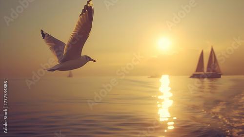 Lone seagull soaring gracefully above a tranquil seascape, with distant sailboats silhouetted against the horizon at golden hour