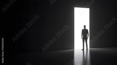 Lone silhouetted figure standing in the doorway of an illuminated passage creating a sense of mystery anticipation and the potential for a new journey or life chapter