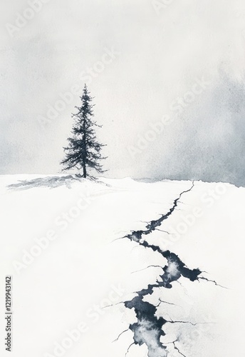 tree, winter, snow, landscape, cold, glacé, ice, fractured, fissure, solitary, lonely, desolate, barren, bleak, stark, white, grey, blue, dark, sombre, moody, serene, peaceful, quiet, calm, tranquil, still, silent, isolated, alone, distant, remote, huge, expansive, open, sky, horizon, air, atmosphere, watercolor, painting, art