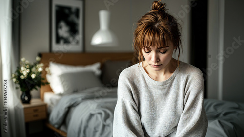 Lonely Depressed Woman Sitting in Bedroom Looking Down