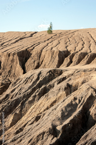 Lonely green tree on a hillside in a sunny day. The hillside is eroded.