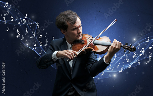 Lonely musical composer with violin and sparkling musical notes around