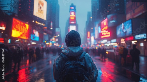 lonely, wanderer, neon, urban, rainy, city, night, light, blurred, reflections, backpack, hoodie, solitude, exploration, travel, adventure, street, downtown, colourful, vibrant, wet, atmosphere, mysterious, crowd, building, signs, metropolis, people, weather, nightscape, journey, modern, moody, cinematic, perspective, outdoors, calmness, introspection, individuality, urbanite, gloaming, bustling, futuristic, enigmatic