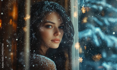 Lonely woman looking out the window on Christmas Eve, snow falling