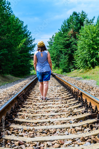 Lonely young woman on a railway in forest