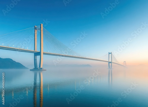 Long cable-stayed bridge spanning calm water with reflections and morning mist under clear blue sky and soft sunlight