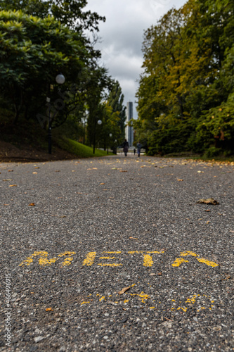 Long concrete path with meta sign in Citadel park with trees and lamps around