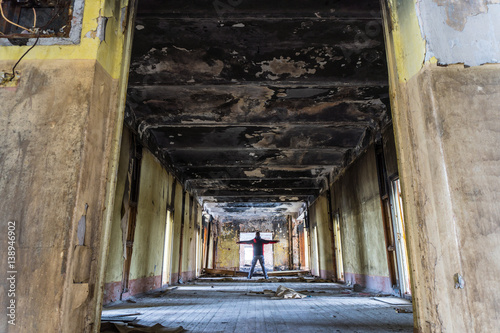 Long corridor of abandoned and burnt building with a man who stands in the center and spreads his hands