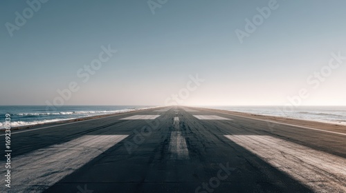 Long empty runway stretching into the ocean horizon, with calm waves visible at the edge.