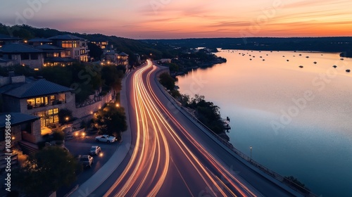 Long exposure shot of a curving road with light trails by a lake at sunset, featuring illuminated houses and boats on the water, creating a serene evening scene.