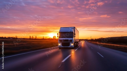 truck, transportation, highway, sunset, logistic, cargo, shipping, haulage, scenic route, sunrise, freight, delivery, driver, vehicle, road trip, sky, horizon, landscape, cloudy sky, travel, journey, countryside, motion, speed, blur, long distance, open road, automotive, headlamp, twilight, dusk, evening light, connection