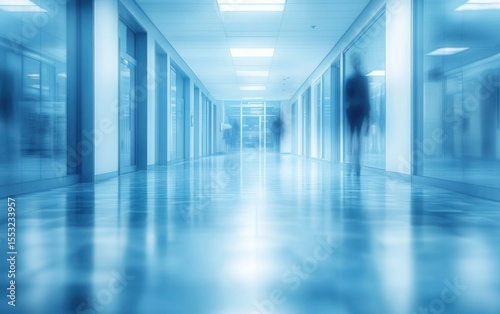 corridor, hallway, modern, office, building, interior, light, ceiling, indoor, architecture, corporate, empty space, perspective, blue tone, clean, roomy, bright, professional