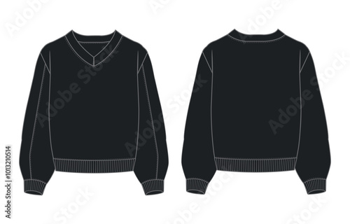 Long sleeves v-neck Cotton-terry Fleece sweatshirt technical fashion flat illustration With regular fit crew neckline. Flat Sketch jumper apparel vector template front, back view.
