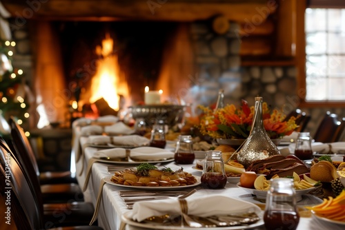 banquet, fireplace, feast, dining, elegant, cosy, warmth, celebration, interior