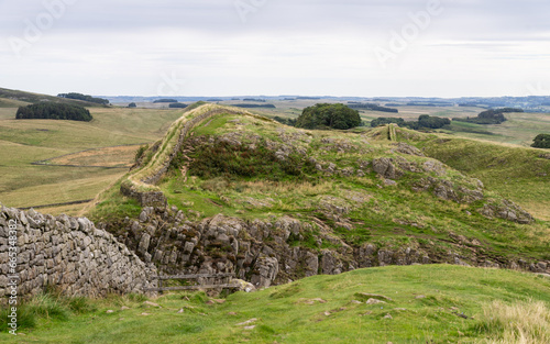 looking across at Hadrian's Wall winding across craggy hills near Housesteads, Northumberland, UK