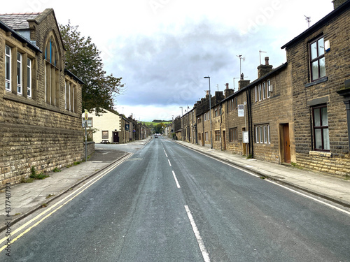 Looking along, Huddersfield Road, with old stone built houses, on a cloudy day in, Newhey, Rochdale, UK