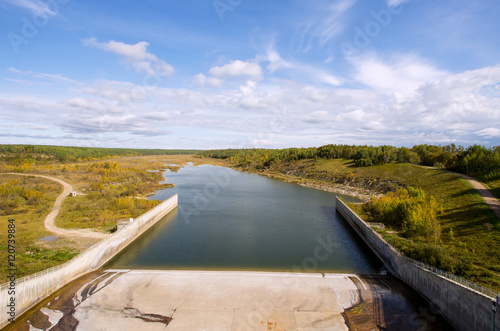 landscape, water, tree, looking down, dam, lake, river, forest, station, concrete, autumn, fall, cloud, floor, trail, road, wispy, outgoing, dry, scenic