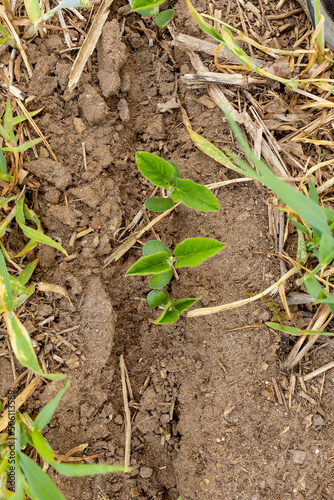 soybean, little, young, plant, drilled, field, rye, cover, crop, leaf, grain, commodity, regenerative, sustainable, dirtied, up high, agriculture, farming, farm, farm field, growth, spring, green, brown, protein, row