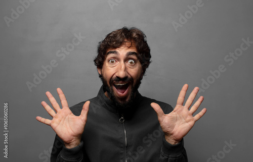 surprised, expression, unexpected, fun, excitement, winner, successful, happiness, shocked, amazed, laughing, smile, wow, reaction, happy, surprise, hand, celebrate, cheerful, excited, beard, bearded, man, male, young, adult, young adult, crazy, mad, winter, cold, weather, coat, clothes, stationary, jacket, isolated, copy, copy space, space, blank, text, place, humor