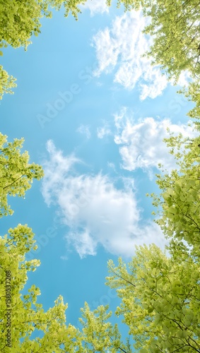 sky, cloud, tree, nature, background, wallpaper, scenery, blue, green, leaf, daylight, outdoors, treetop, cloudscape, foliage, tree branch, summer, spring, environment, idylli, serene, peaceful, fresh, bright, light, upward, perspective, canopy, clear, season, park, wood