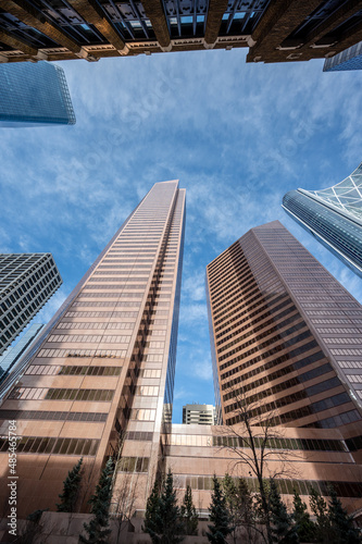 Looking up at skyscrapers in the city of Calgary.