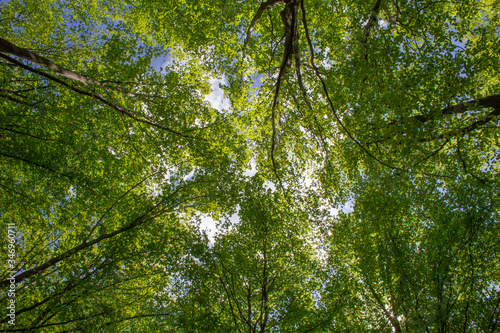 Looking up through the spring green forest with the sun shinning in the blue sky