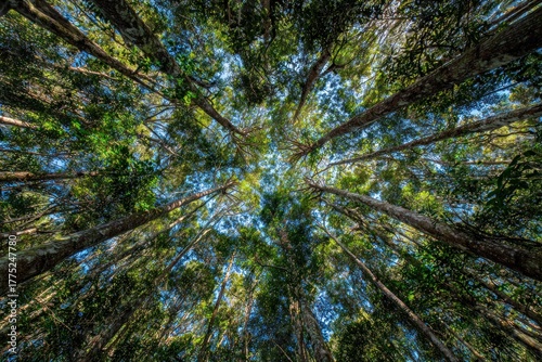forest, tree, canopy, sky, sunlight, perspective, green, branch, texture, light, shadow, nature, outdoors, up high, tall, pattern, line, upward, angle, view, wood, leaf, wood, bark, ground, environment, ecosystem, flora, botany, tropical, natural, landscape, dense, lush, vertical, wild, wilderness, majestic, serene