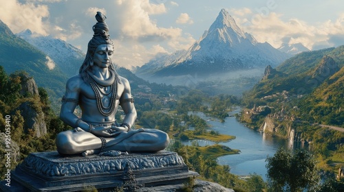 lord, shiva, statue, mountain, river, vale, serene, majestic, landscape, nature, spirituality, meditation, culture, hinduism, artwork, divine, scenery, calmness, worship, beauty, icon, symbol, peaceful, scene, outdoors, sky, greenery, river bank, heritage, ancient, tradition, pilgrimage, elevated, grandeur, surrounding, inspiring, god, craftsmanship, environment, hill, blue, sunshine, epic, adventure, scenic, panoramic, view, calm